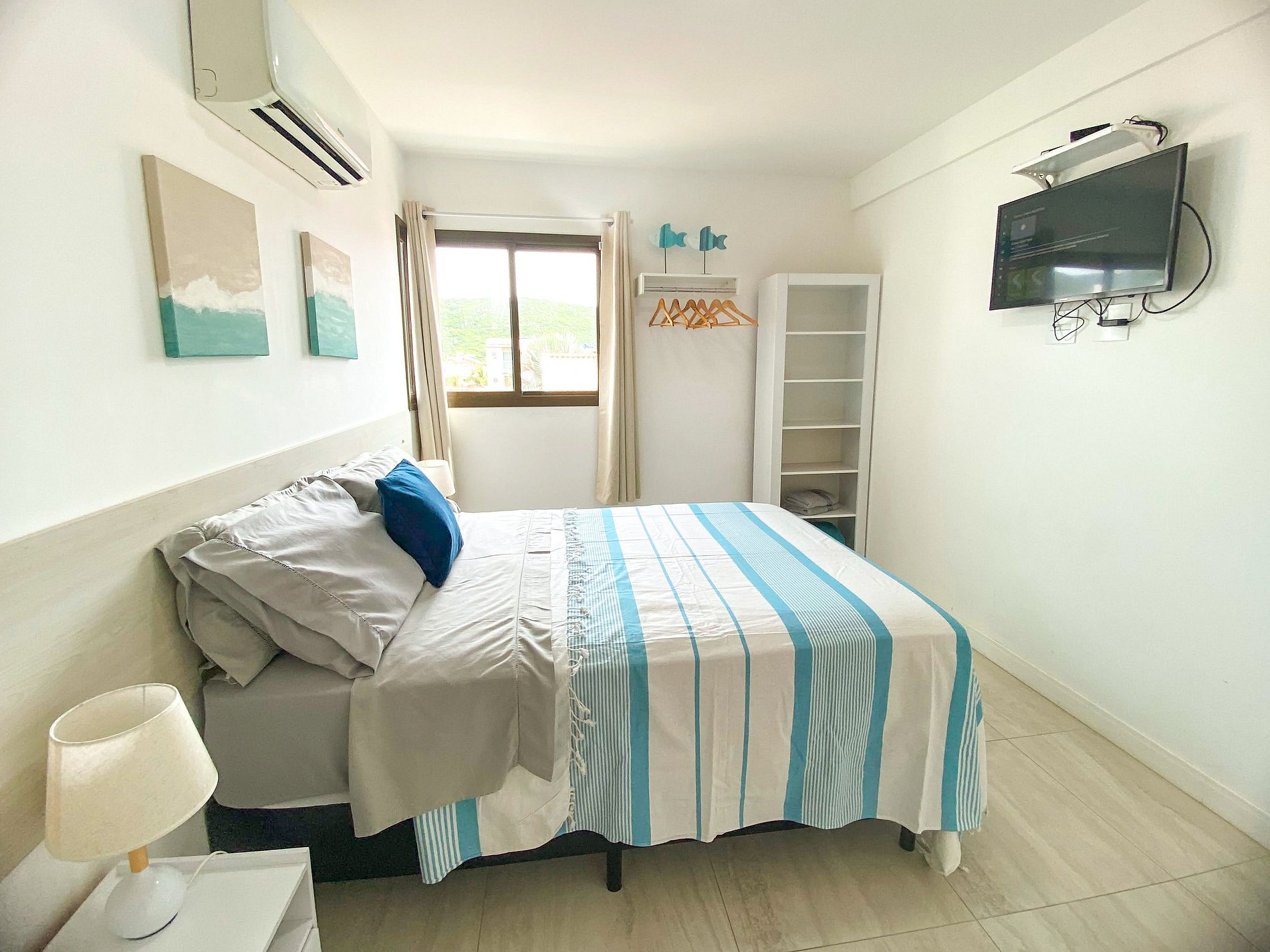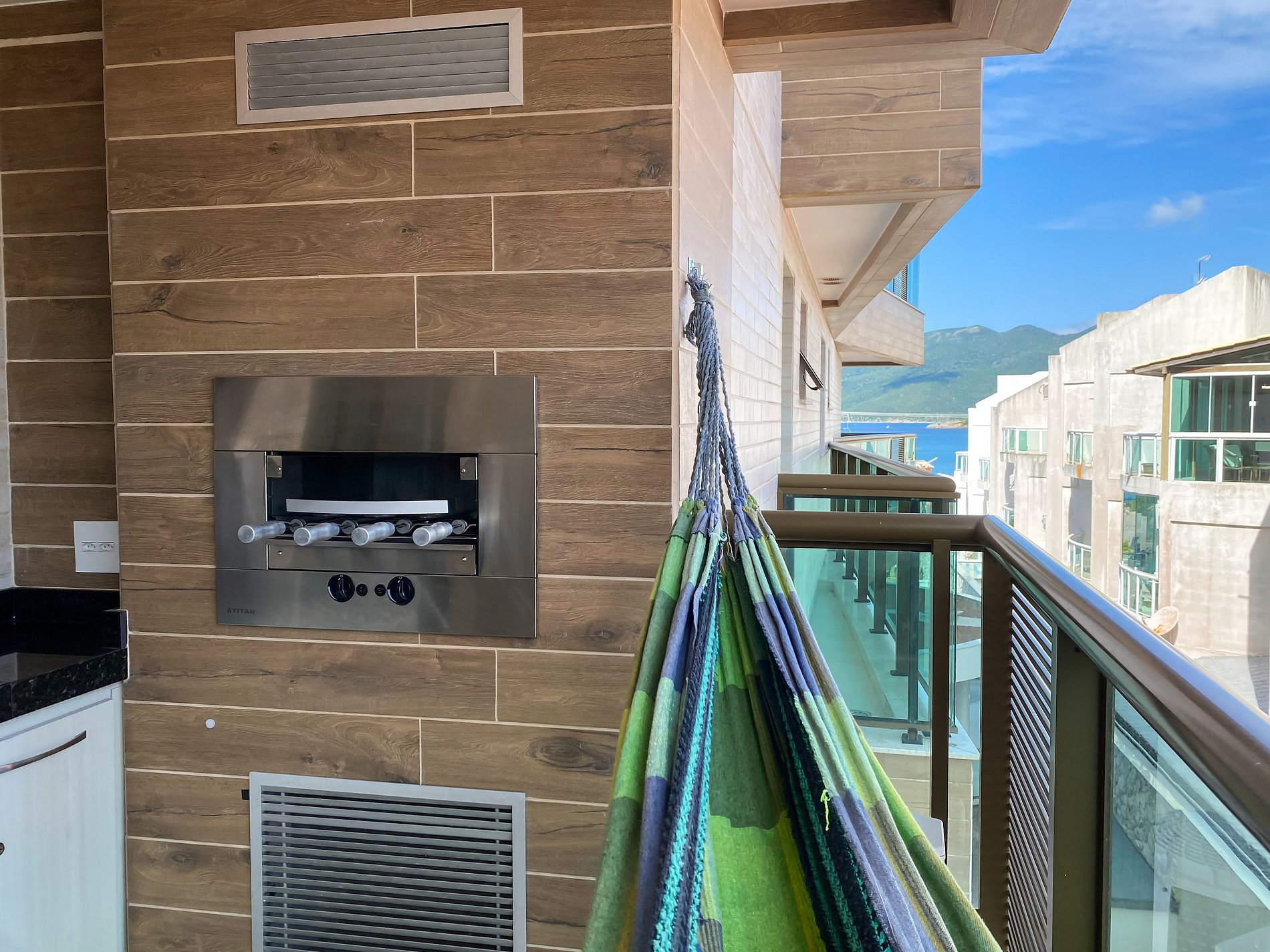 * Sala com ventilador, sofa cama e TV Smart. * A suíte tem cama de casal, espaço para as roupas e as malas e banheiro com chuveiro aquecido a gás, uma maravilha!. Tem ar condicionado e TV. * Quarto com duas bicamas de solteiro (sai uma cama extra de baixo de cada cama individual). Tem ar condicionado e espaço para guardar as roupas. * Varanda com vista lateral parcial do mar e churrasqueira a gás, mesa e cadeiras. * Area com tanque para lavar as roupas. * Uma vaga de estacionamento coberto, no subsolo. Segurança 24 hs no condomínio. * São inclusas na estadia as roupas de cama, travesseiros, uma toalha de banho por pessoa e uma toalha de rosto em cada banheiro. Na cozinha terá 2 panos de prato e um pano de chão.